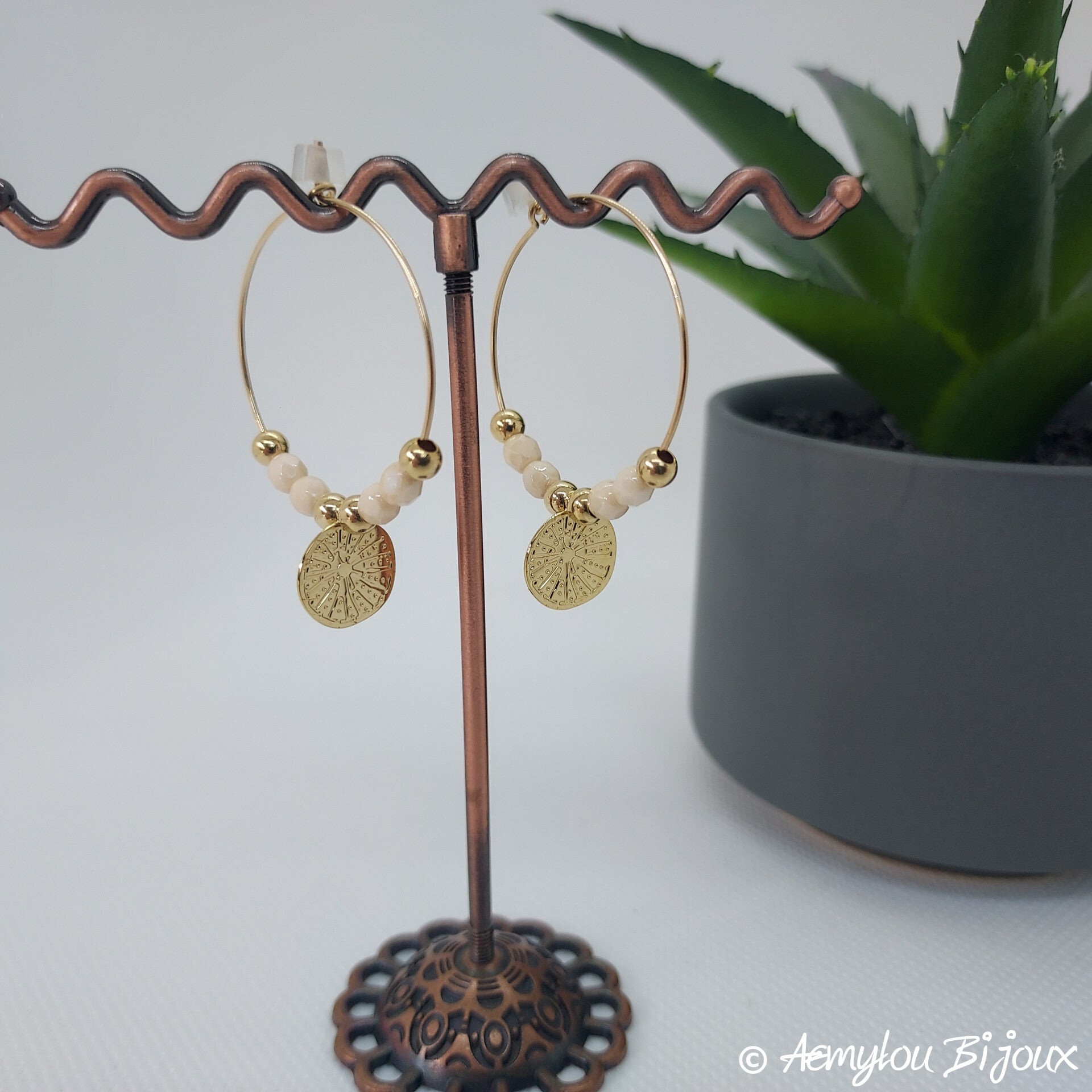 Créoles dorées (Gold Filled) de 30mm de diamètre, agrémentées de perles de bohème facettées de couleur crème (4/3mm), de perles GF de 4mm et de sa breloque 'Oursin' de 12mm de diamètre.