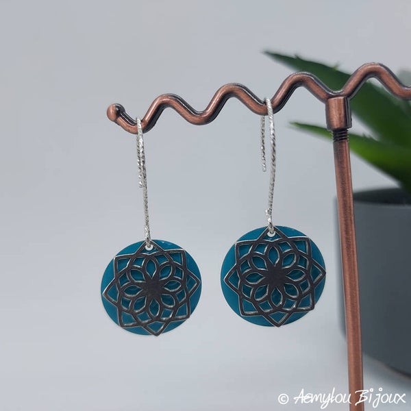 Disque en résine époxy de 20mm de diamètre, couleur bleu turquoise, et sa breloque 'Etoile mandala', montés sur crochets d'oreille en Argent 925 diamanté.